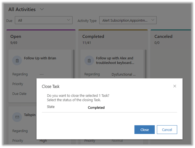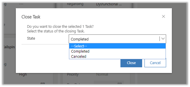 Within the Close Task Dialog box, we have the option to specify Completed or Cancel for the task.