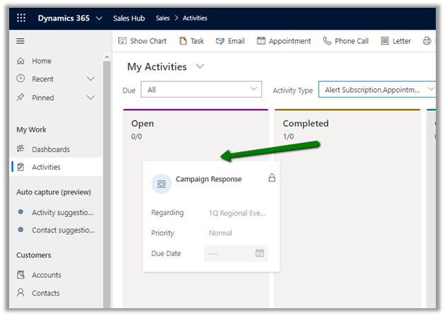 Below we are moving Campaign Response activity record from Completed to Open lane.