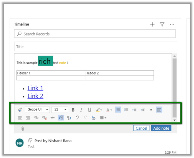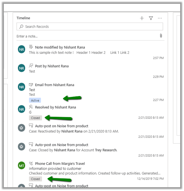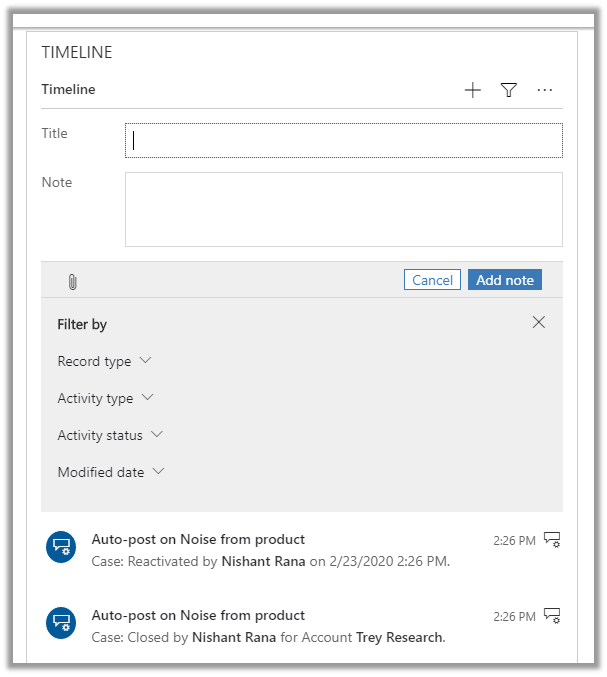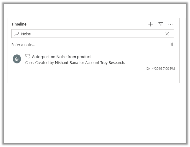 Below is the screen shot of the Timeline control in the previous version 2019 Release Wave 2, without rich text capability in notes, no search option, no status indicator and no “Posts By” filter version