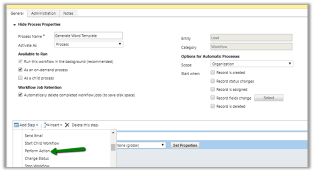 To enhance it further, we can write a custom workflow that calls the SetWordTemplate in Perform Action step.