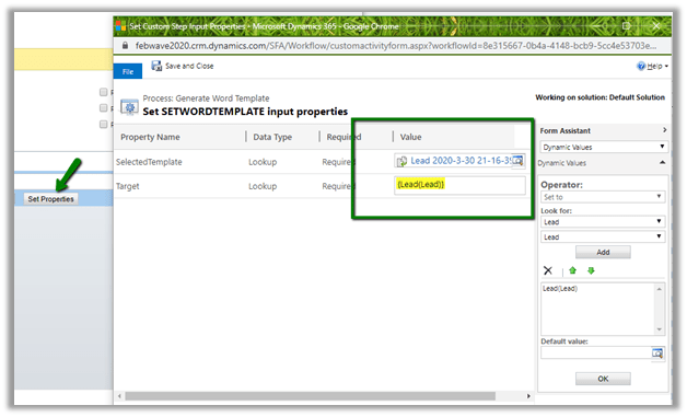 Specify the Document Template and the associated entity (e.g. lead) for its input properties.