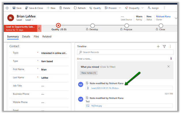 After refreshing the timeline, we can see the new note record created with the document as attachment to it.