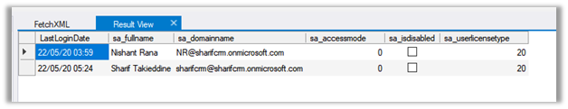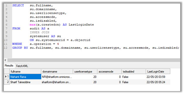 SELECT su.fullname, su.domainname, su.userlicensetype, su.accessmode, su.isdisabled, max(a.createdon) AS LastLoginDate FROM audit AS a INNER JOIN systemuser AS su ON su.systemuserid = a.objectid WHERE a.operation = 4 GROUP BY su.fullname, su.domainname, su.userlicensetype, su.accessmode, su.isdisabled;