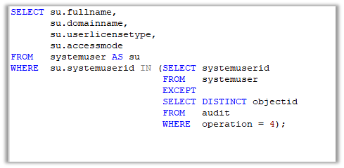 SELECT su.fullname, su.domainname, su.userlicensetype, su.accessmode FROM systemuser AS su WHERE su.systemuserid IN (SELECT systemuserid FROM systemuser EXCEPT SELECT DISTINCT objectid FROM audit WHERE operation = 4);