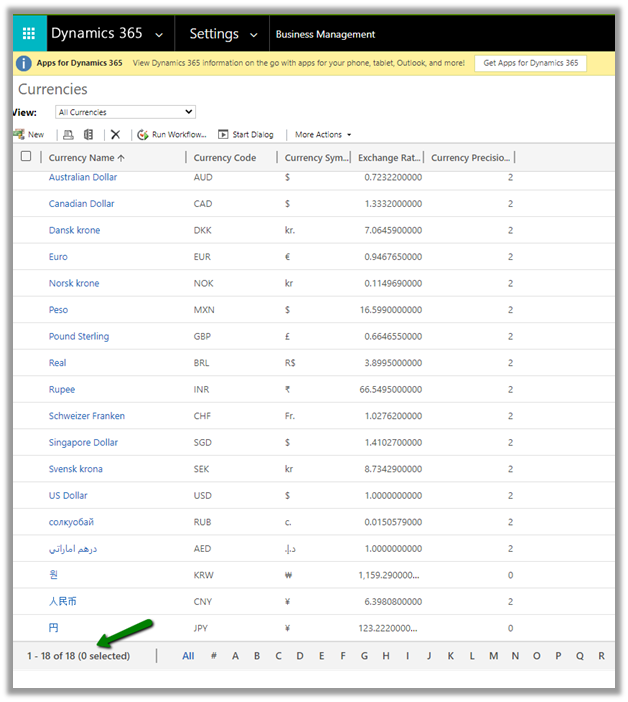 By default, we can see 18 currencies defined.