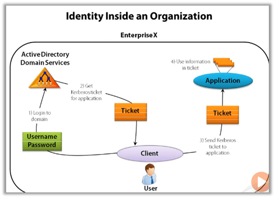 The user enters his username and password to login to the domain. Now to access any application in the domain, the user gets the Kerberos ticket for the application from the AD. The ticket contains basic user information and is digitally signed by AD. The user provides this detail to the application, which checks the signature and makes sure it is issued by AD. Application, as it trusts the AD, uses the information in the ticket to perform the corresponding action.