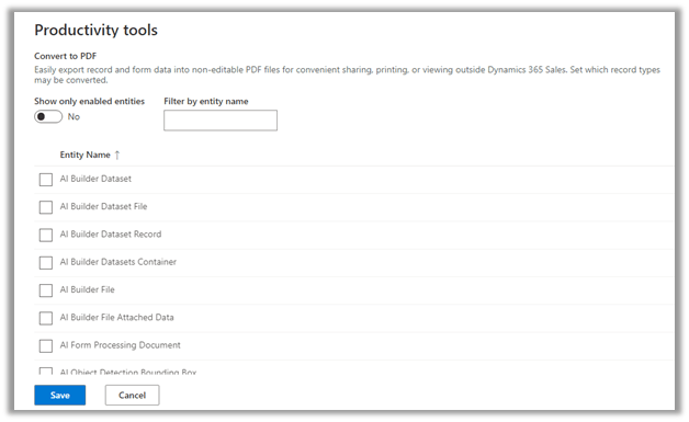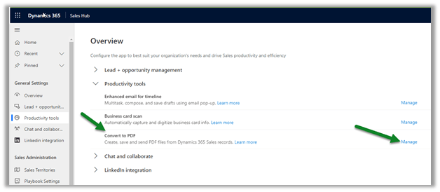 In Sales Hub, navigate to App Settings – Productivity Tools – Convert to PDF and select Manage
