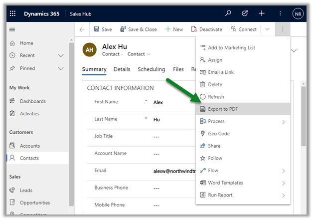 We can see the “Export to PDF” command added after enabling the Convert to PDF option in the contact entity.