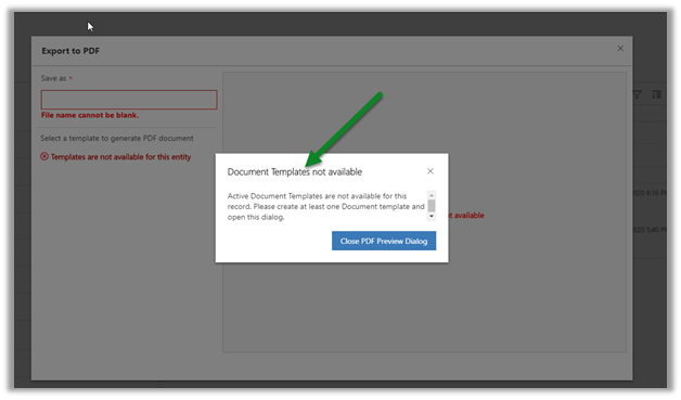 Clicking on it we are presented with below options if we do not have any active document template available for that entity.