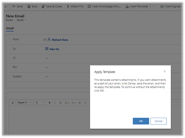 Now if we create a new email and try to apply the above template, we will be presented with the below message, which asks us to save the record first and then inserts the template, if we want the attachments to be part of it.