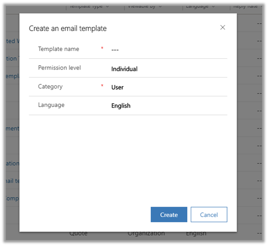 Clicking on New brings the below window, where we can specify Template Name, Permission Level, Category (entity), and Language.