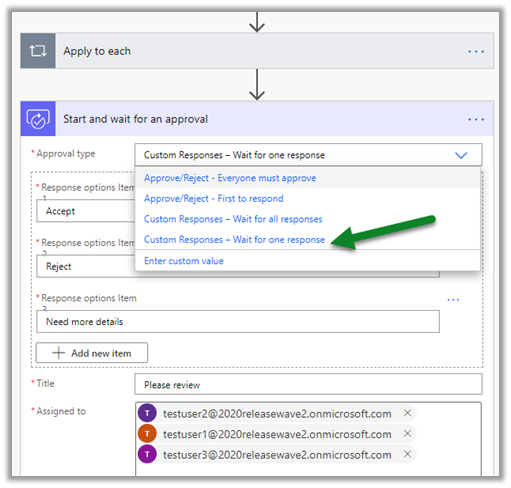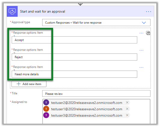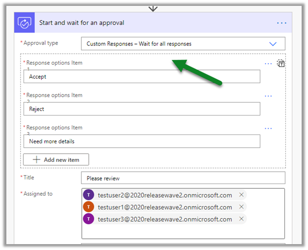 Let us update our previous flow to use Approval Type – Custom Responses, using which we can define our custom response options (instead of limiting ourselves to Approve and Reject)