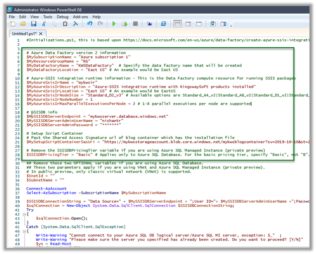 With things now setup, let us get the PowerShell script to provision the Azure-SSIS Integration Runtime Initializations.ps1 and update it.