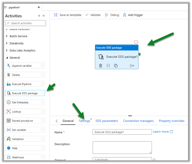 Drag and drop the Execute SSIS Package and click on the Settings tab.