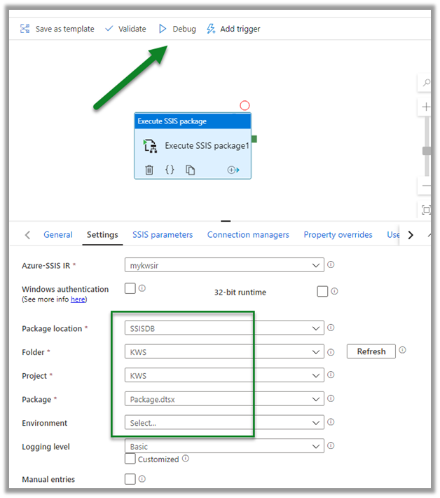 Connect to the package deployed followed by Validate and Debug to test the pipeline.
