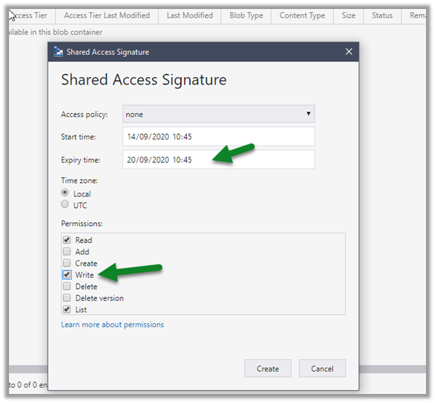 Specify the expiry time along with Write permissions, this is for logging purpose when the Azure-SSIS IR is being provisioned.