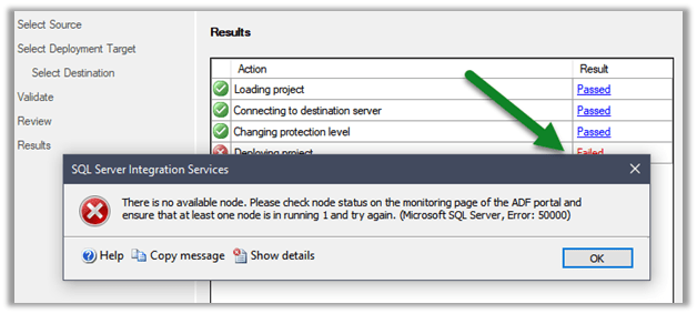 There is no available node. Please check node status on the monitoring page of the ADF portal and ensure that at least one node is in running 1 and try again. (Microsoft SQL Server, Error: 50000)