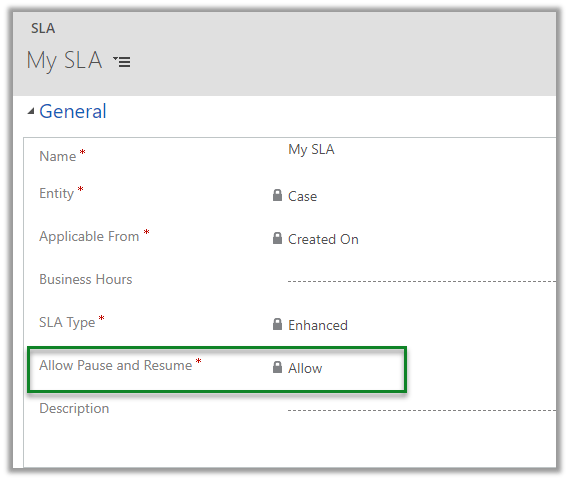 The way we currently configure Pause and Resume for an SLA is by setting the Allow Pause and Resume field to Allow.