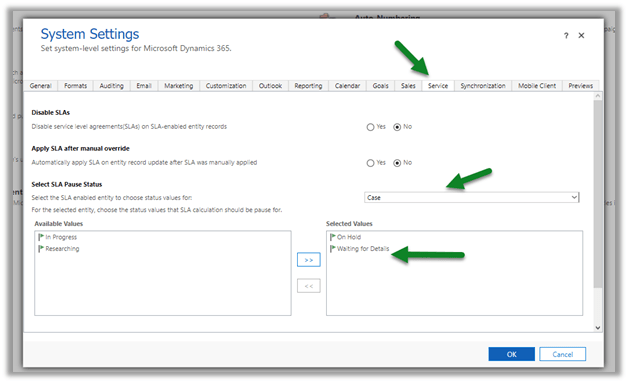 And within the Service Tab of System Settings, we can define the status values on which the SLA calculation should get paused at the entity level.