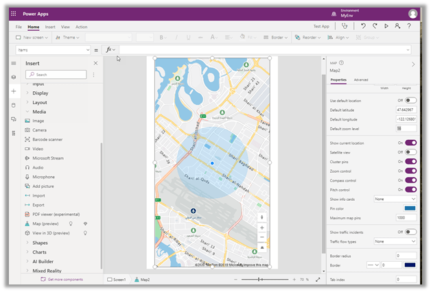 More on Map component –https://docs.microsoft.com/en-gb/powerapps/maker/canvas-apps/geospatial-component-map