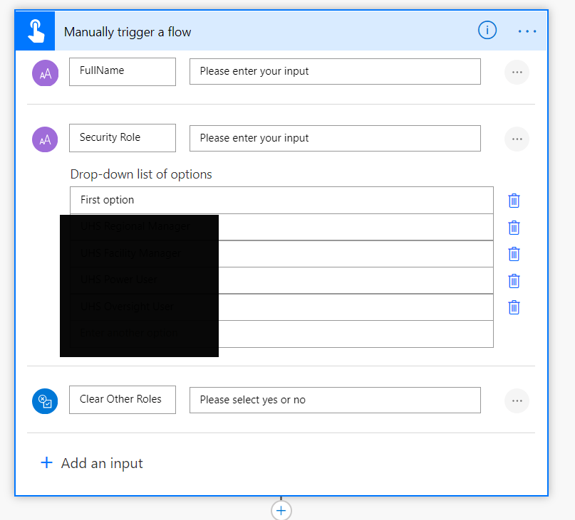 - Security Role – it can be a text input also. Here I have used it as dropdown input. The values are the Security Role Names.