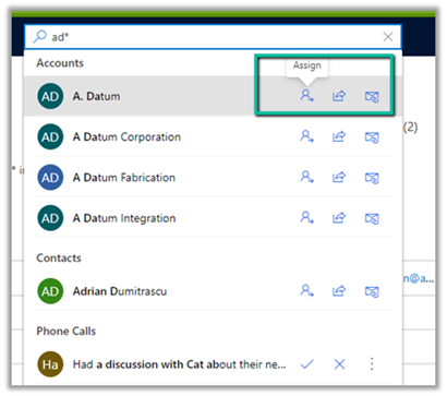 E.g. we have Assign, Share, Email quick actions available for Contact, Account, and other entities for the relevance search results.