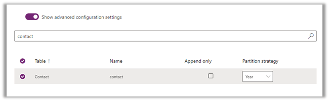 For contact, we have enabled the advanced configuration settings and opted for Partition Strategy as Year.
