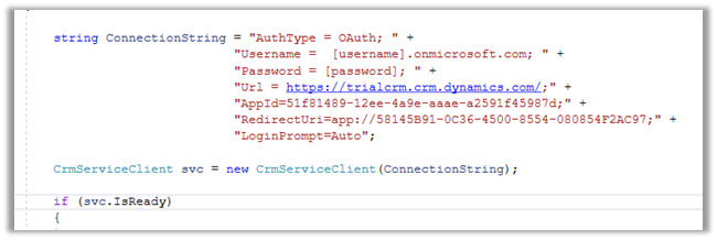 CrmServiceClient svc = new CrmServiceClient(ConnectionString);