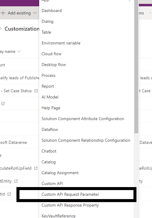 Once the custom API is created, in the Solution, Click New -> Select Custom API Request Parameter.