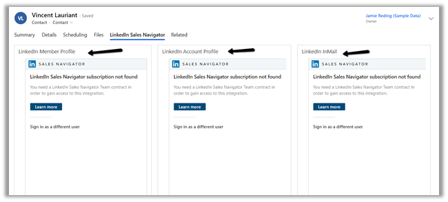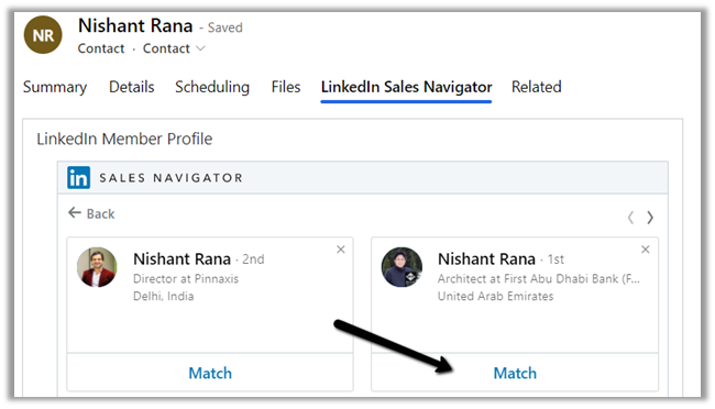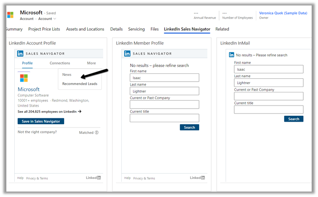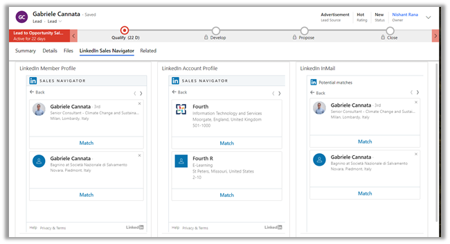 We can see the LinkedIn Sales Navigator tab added to the Lead, Opportunity, Contact, and Account form.