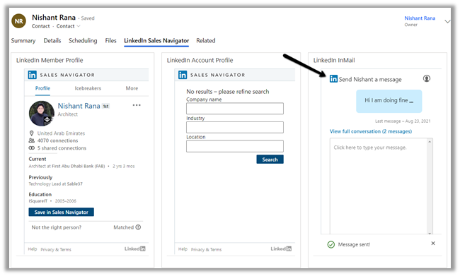 Back inside our LinkedIn Member Profile, we can message and connect with the profile populated from within the Contact form.