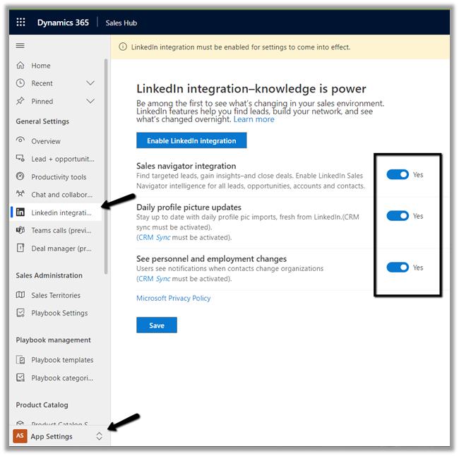 To enable the LinkedIn Sales Navigator Integration with Dynamics 365 Sales, navigate to App Settings >> General Settings >> LinkedIn Integration and click on Enable LinkedIn Integration