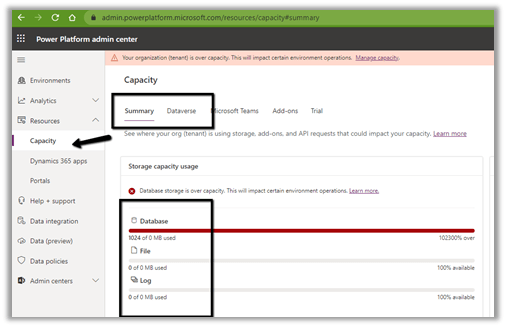 We can check the same at Resources >> Capacity inside the Power Platform admin center.