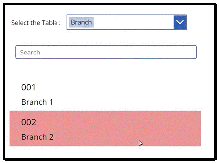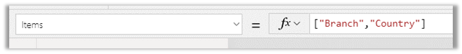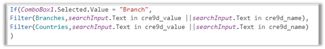 Items = If(ComboBox1.Selected.Value = “Branch”,Filter(Branches,searchInput.Text in cre9d_value ||searchInput.Text in cre9d_name), Filter(Countries,searchInput.Text in cre9d_value ||searchInput.Text in cre9d_name))