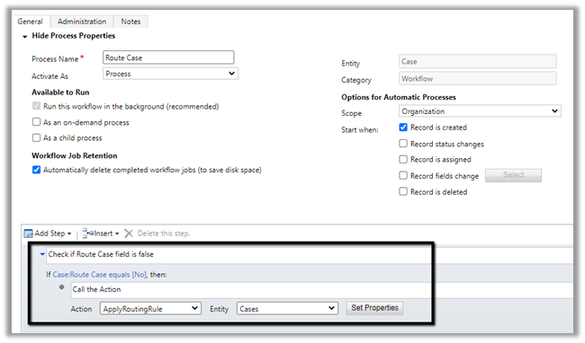 Now if we want to run the routing rules against the case record created from the user interface, we can make use of the following action –