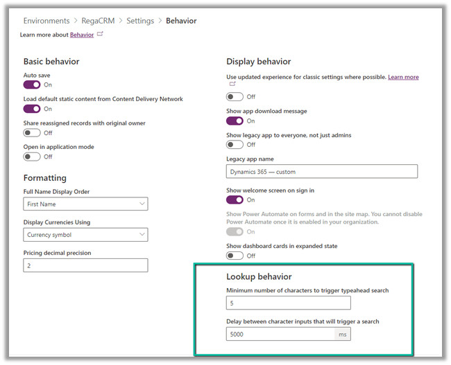 Within Power Platform Admin Center – (https://admin.powerplatform.microsoft.com/) through Environments >> [Name] >> Settings >> Behavior >> Lookup Behavior settings we can control the minimum number of characters entered before triggering the search in the and delay before the search is triggered for the lookups.