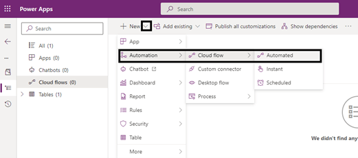 - Click on drop-down arrow next to “New” button >> Select “Automation” >> then select “CloudFlow” >> then select “Automated Cloud flow”