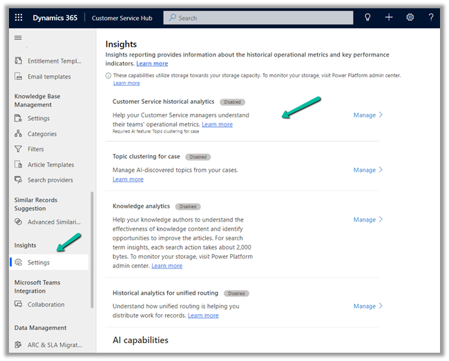 Customer Service Hub >> Service Management >> Insights (Settings)