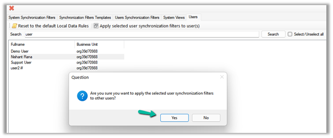 For Question Dialog Box – “Are you sure want to apply the selected user synchronization filters to other users ?” – select Yes
