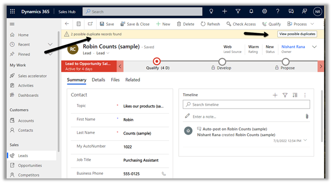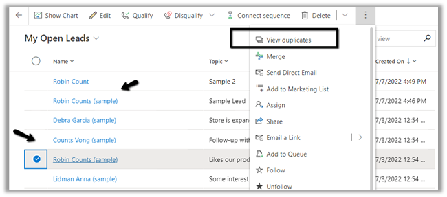 After this new detection rule is enabled, we can select the potential duplicate lead record and select the View duplicates option from the command bar.
