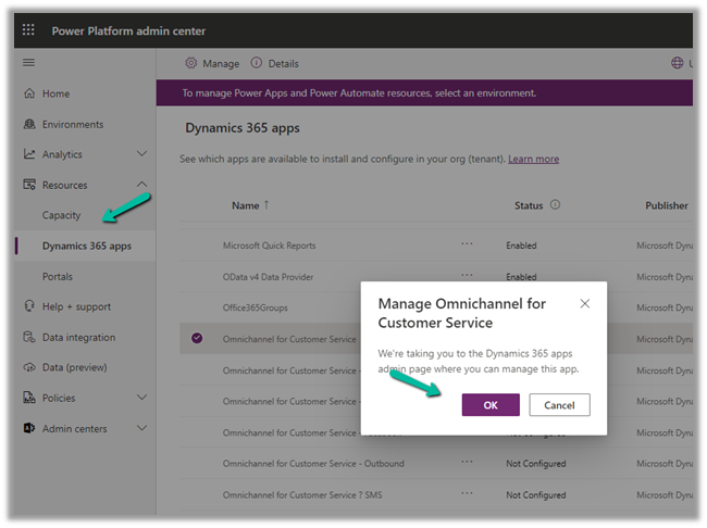 Interestingly if we navigate to Resources >> Dynamics 365 apps and check the Omnichannel for Customer Service app we see the status Not configured.