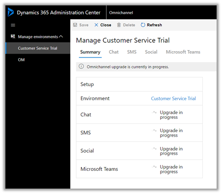 From the Admin Center, we managed to upgrade the Omnichannel in the Customer Service Trial environment and also configure it in another sandbox environment.