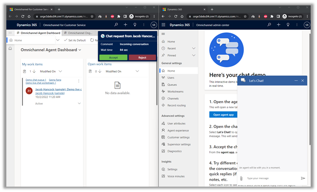 Opening the Omnichannel Admin Center app allows us to configure the Chat Demo.