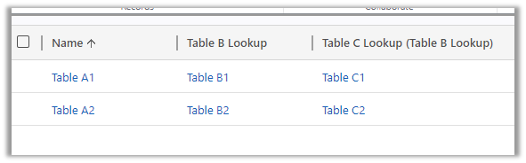To get the Table C name, perform a Lookup on Table B, where Table B GUID is equal to Table A’s Table B lookup field, and then fetch the Table C Lookup’s name from Table B.