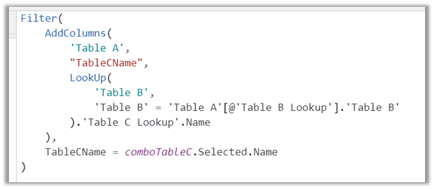 One of the ways we could implement this is by using the AddColumns to add Table C data to Table A and apply the Filter to it.