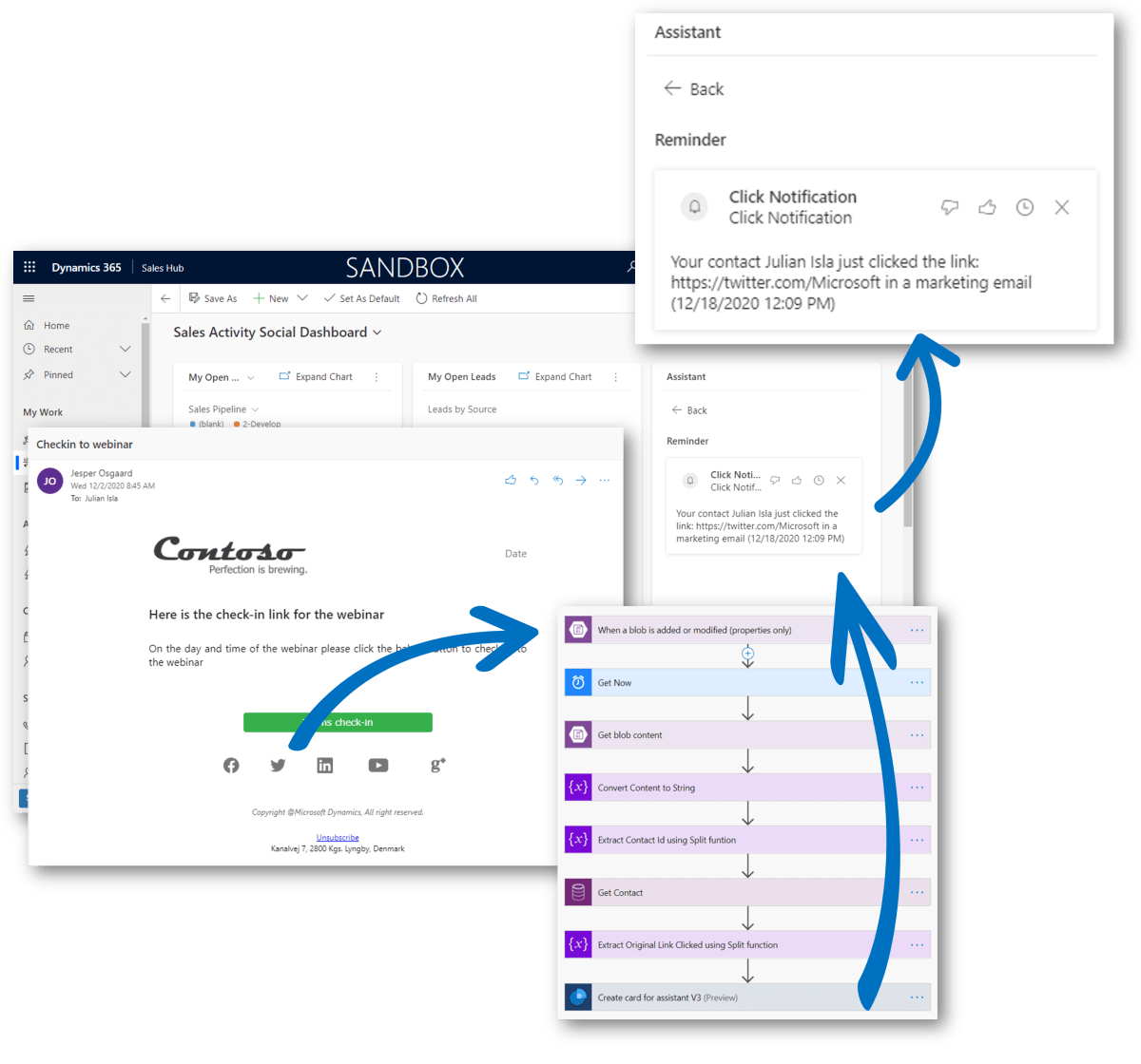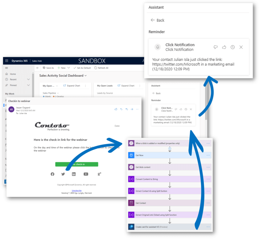 So what if you will want to tap into those interaction data? What if you are looking for a way to fire up an action card (or an email) to sellers if one of the contacts they own does something interesting, e.g. clicks a “learn more” link in a marketing email, or something similar?