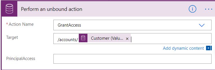 4. PrincipalAccess which needs to be in JSON format, which will include user or team to which the access will be provided and the Access Mask for the Privilege they will be given.