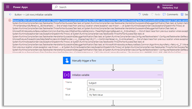 One thought on “Resolved – Request to XRM API failed with server error: ‘Message: Timeout occurred when calling the XRM api’ Code: InnerError: Type: System.Threading.Tasks.TaskCanceledException Message: A task was canceled in Power Automate”