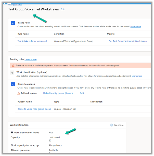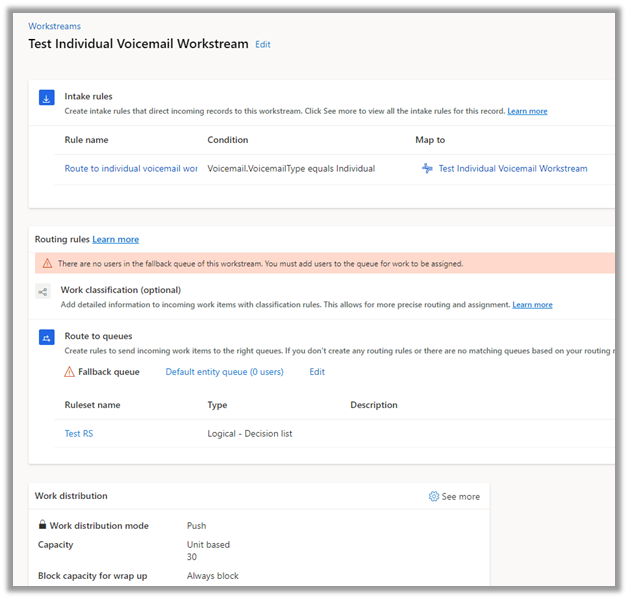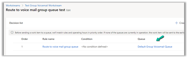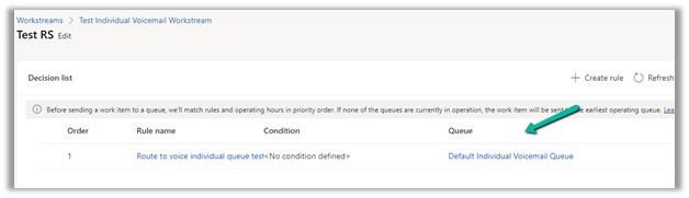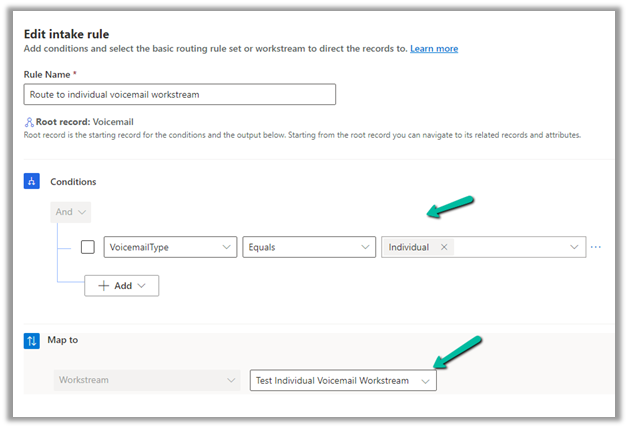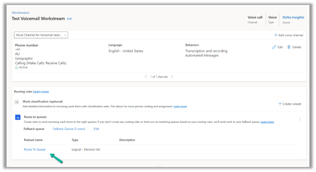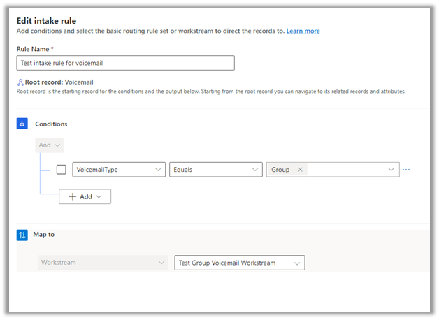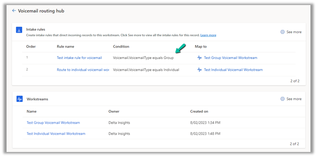 We have 2 intake rules configured, one for Voicemail type individual (which worked in our earlier scenario, when a customer called the personal number of the agent) and one for a group that would apply to Queue.