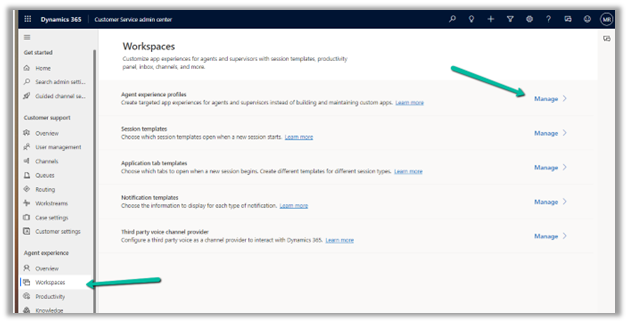 Navigate to Agent Experience >> Workspaces and select Manage for Agent experience profiles.